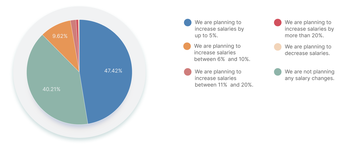 The research shows that 59.1% of employers plan to raise salaries in H1 2025, while 40.21% do not foresee changes, and 0.69% predict salary reductions. Among those increasing salaries, more than half (52.33%) will apply raises to all employees.
